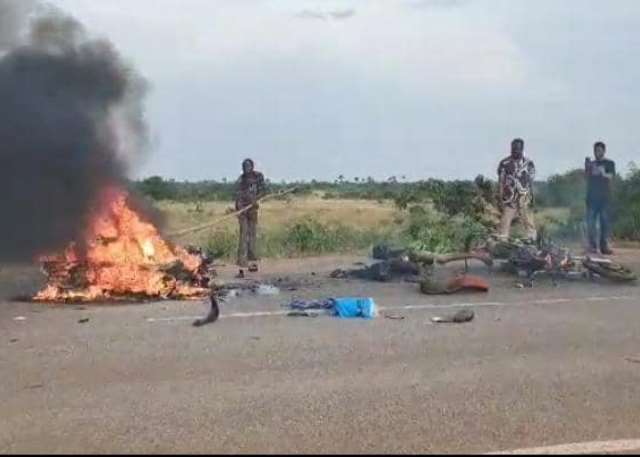 Investigations suggest that the motor rider and his passenger had purchased fuel and were transporting it in a gallon. The impact of the collision caused the fuel to spill, igniting a fire that engulfed both motorbikes.