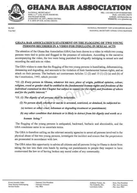 Meanwhile, the Ghana Bar Association (GBA) has said the flogging of the two young persons, as captured in a video, is “humiliating, dehumanising, demeaning and degrading.”